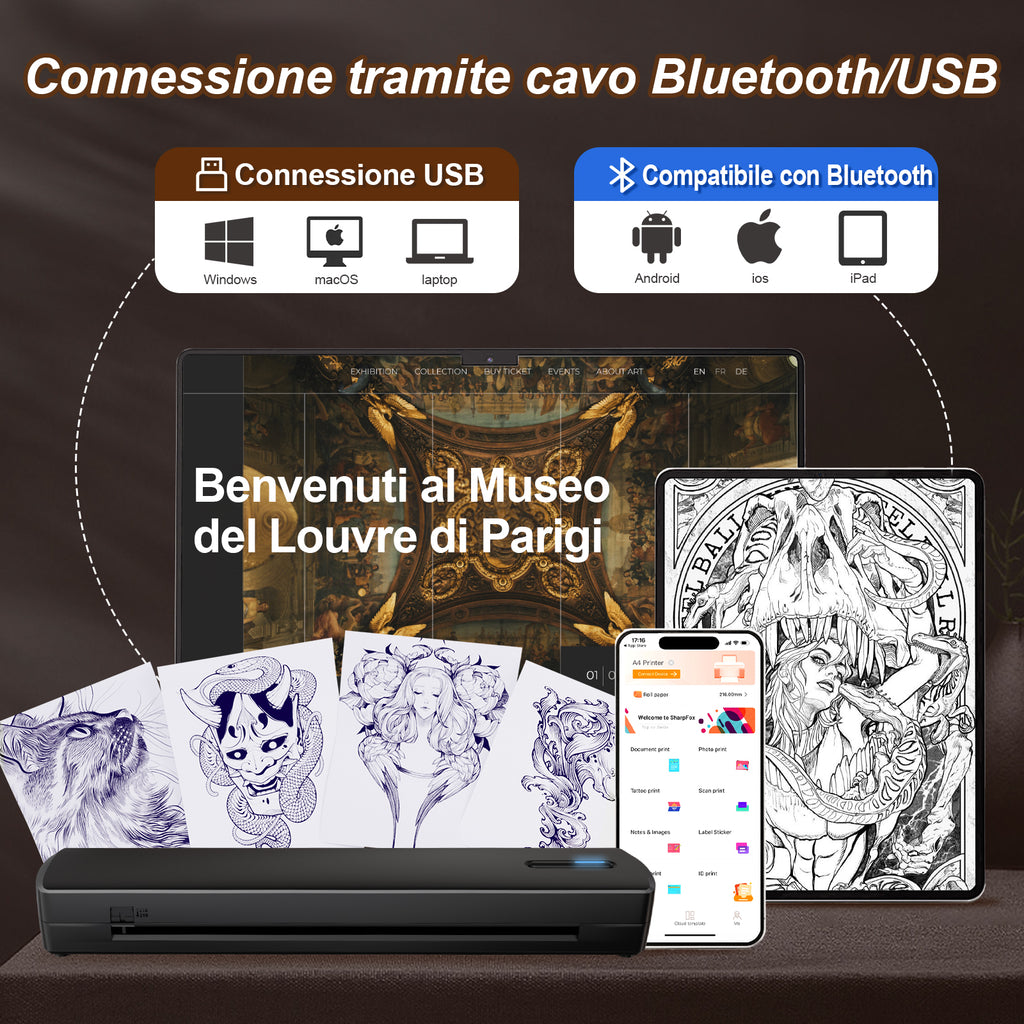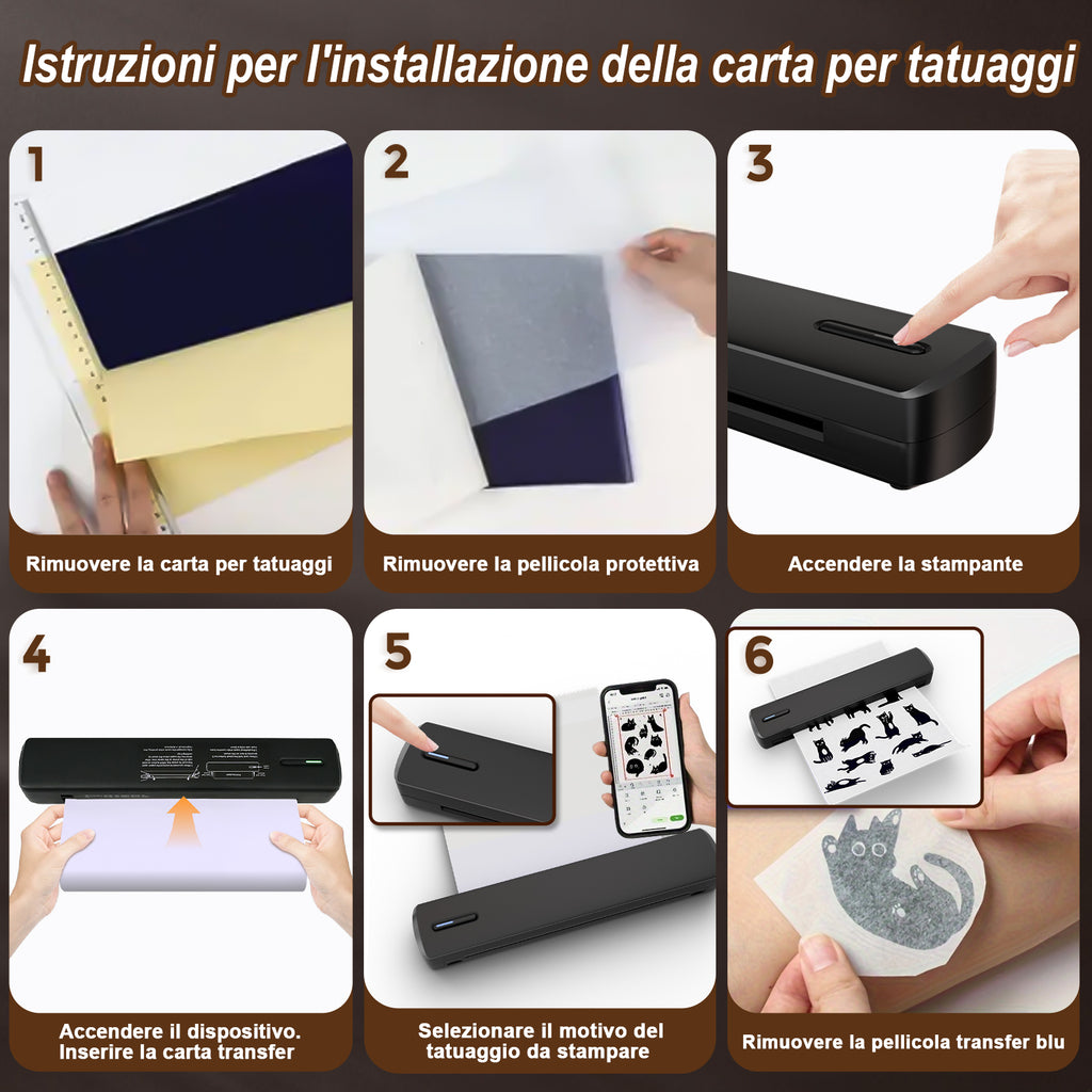Questa stampante senza inchiostro è compatibile anche con la carta transfer per tatuaggi. Ordina oggi stesso la carta transfer premium per la stampa di stencil per tatuaggi!